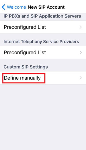 - When you first open Media5-fone you will be presented with an initial Welcome Screen. Tap "Start" at the top right-hand corner of the screen and you will then be asked to configure your new Pro-Talk account. Essentially, we need to input the information which will enable Media5 to access our Pro-Talk account so that we can start making and receiving calls. Tap "Define Manually" as shown below.
