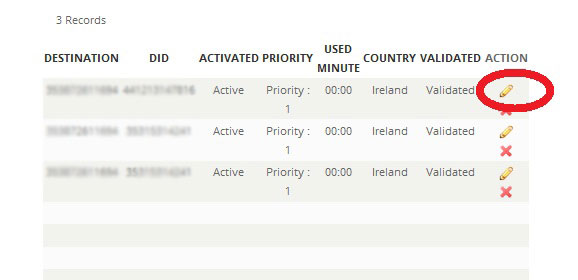 - Towards the bottom of the following page, you will see a list of phone numbers to which you have subscribed. Click on the Pencil icon beside the DID you wish to edit.