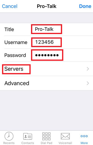 - Next, you will be asked to enter your account details. Enter the Username and Password which you obtained in Step 3 (You may enter anything you like in the "Title" box because this is only used for your own reference and does not affect access to your account). Once you have entered the relevant information, tap "Servers" as shown below.