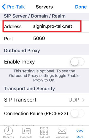 - On the following page you will see a lot of information, but the only thing you need to do is enter "signin.pro-talk.net" in the "Address" box. After that, select "Done" in the top right-hand corner.