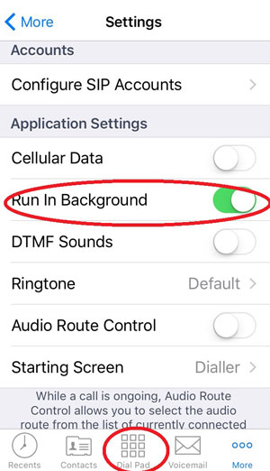 - Ensure that "Run in background" is enabled. By default, it should be enabled but, if it is not, tap it to enable. Once enabled, you are done and can ho back to the Dial pad by tapping its icon at the bottom of the screen.